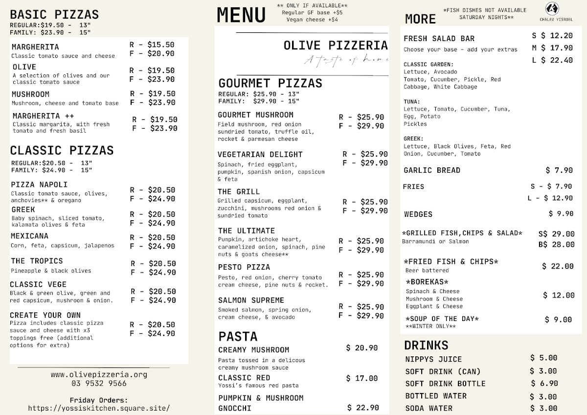 For something more gourmet, Olive Pizzeria’s Gourmet Pizzas include the savory Pesto Pizza, indulgent The Ultimate, and vegetarian options like Vegetarian Delight. Additionally, pasta lovers can enjoy comforting dishes like the Classic Red Pasta, Pumpkin & Mushroom Gnocchi, and creamy Creamy Mushroom Pasta. The Fresh Salad Bar includes refreshing options such as the Greek Salad and Tuna Salad, making it easy to complement your meal. If you’re craving sides, don’t miss out on Garlic Bread Slice (Large), crispy Fries, or hearty Wedges. For those who enjoy a lighter bite, the Fried Fish & Chips is a great choice.